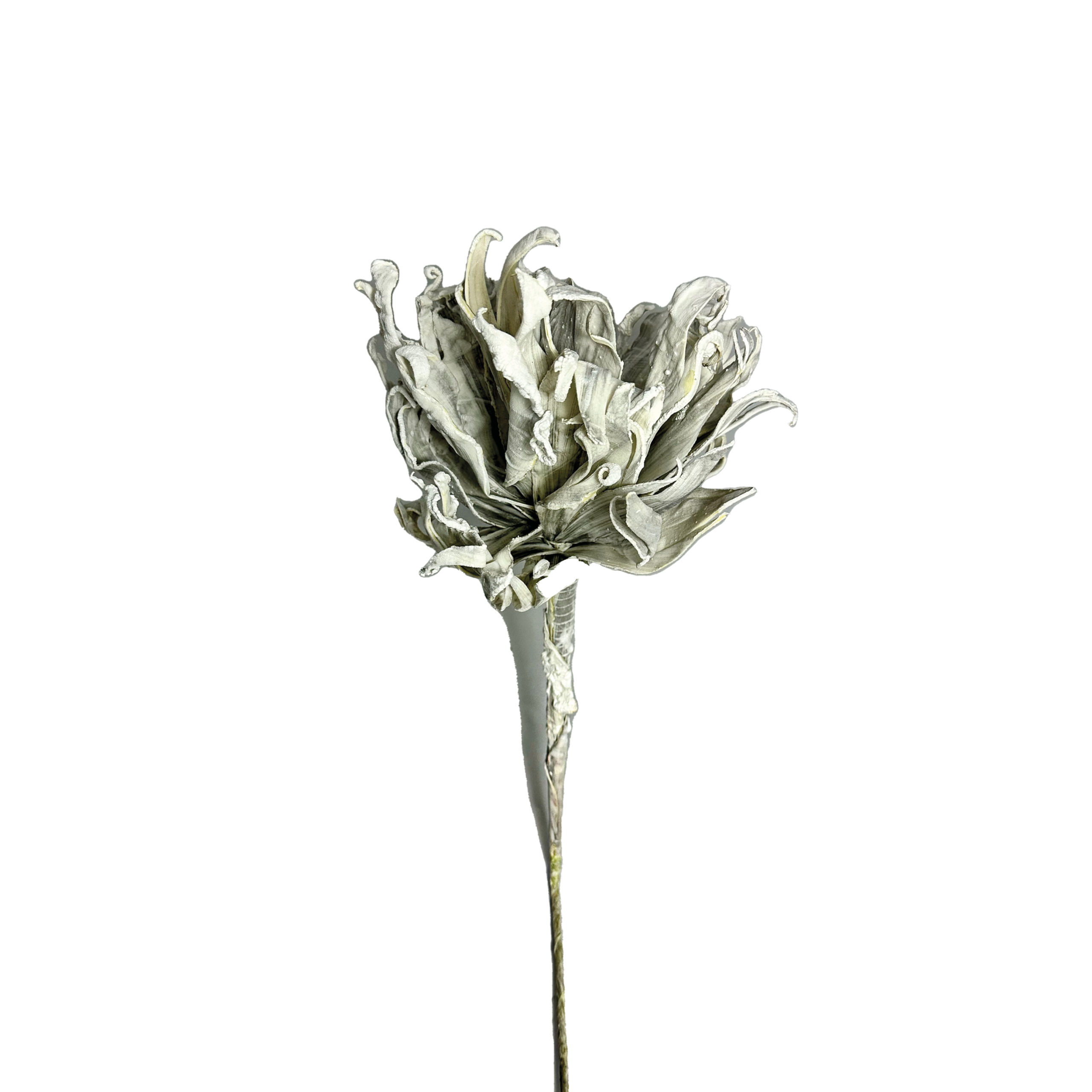 Unsere Foamblüte in Weiß/Grau ist die elegante Kopie einer exotischen Artischockenblüte, die botanisch auch Cynara cardunculus genannt wird.